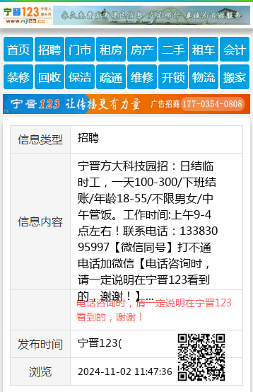 宁晋方大科技园招:日结临时工,一天100-300/下班结账/年龄18-55/不限男女/中午管饭。工作时间:上午9-4点左右!联系电话:13383095997【微信同号】打不通电话加微信 【电话咨询时,请一定说明在宁晋123看到的,谢谢!】 |