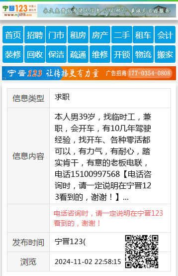 本人男39岁,找临时工,兼职,会开车,有10几年驾驶经验,找开车、各种零活都可以,有力气,有耐心,踏实肯干,有意的老板电联,电话15100997568 【电话咨询时,请一定说明在宁晋123看到的,谢谢!】 |