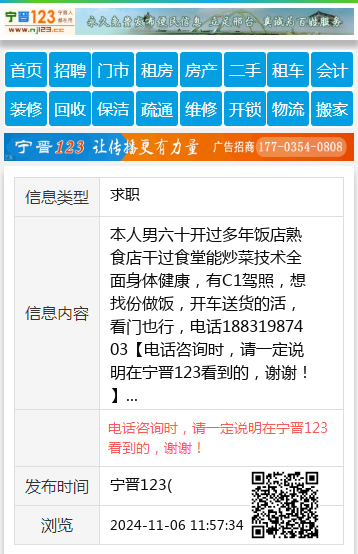 本人男六十开过多年饭店熟食店干过食堂能炒菜技术全面身体健康,有C1驾照,想找份做饭,开车送货的活,看门也行,电话18831987403 【电话咨询时,请一定说明在宁晋123看到的,谢谢!】 |