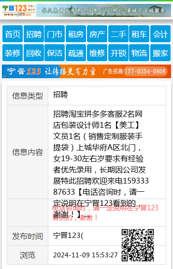 招聘淘宝拼多多客服2名网店包装设计师1名【美工】文员1名(销售定制服装手提袋)上城华府A区北门,女19-30左右岁要求有经验者优先录用,长期因公司发展特此招聘欢迎来电15933387633 【电话咨询时,请一定说明在宁晋123看到的,谢谢!】 |