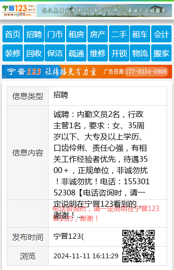 诚聘:内勤文员2名,行政主管1名,要求:女、35周岁以下、大专及以上学历、口齿伶俐、责任心强,有相关工作经验者优先,待遇3500+,正规单位,非诚勿扰!非诚勿扰!电话:15530152308 【电话咨询时,请一定说明在宁晋123看到的,谢谢!】 |