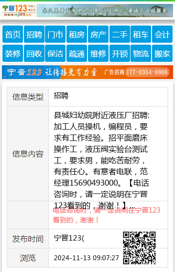 县城妇幼院附近液压厂招聘:加工人员操机,编程员,要求有工作经验。招平面磨床操作工,液压阀实验台测试工,要求男,能吃苦耐劳,有责任心。有意者电联,范经理15690493000。 【电话咨询时,请一定说明在宁晋123看到的,谢谢!】 |