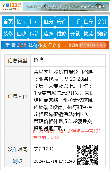 青岛啤酒股份有限公司招聘:业务代表 ,男20-28周,学历:大专及以上。工作:1收集市场信息;2开发、管理经销商网络,维护定格区域内终端;3设计、执行和监控定格区域促销活动;4维护、管理价格体系;5完成领导交办的其他工作。