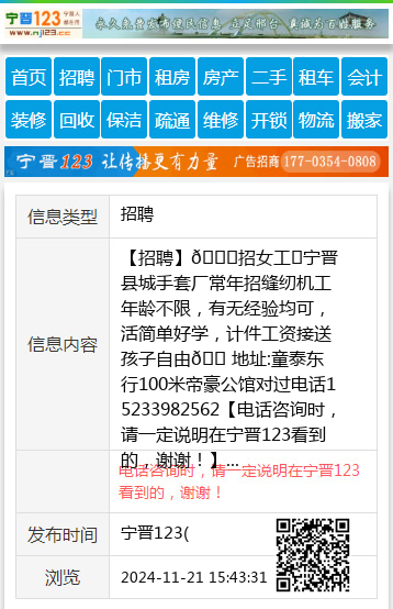 【招聘】🎉招女工✅宁晋县城手套厂常年招缝纫机工年龄不限,有无经验均可,活简单好学,计件工资接送孩子自由🏠地址:童泰东行100米帝豪公馆对过电话15233982562 【电话咨询时,请一定说明在宁晋123看到的,谢谢!】 |