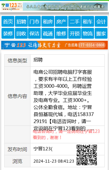 电商公司招聘电脑打字客服,要求有半年以上工作经验工资3000-4000。另聘运营助理,大学毕业应届毕业生及电商专业。工资3000+。公休全勤食宿。地址:宁晋县恒基现代城,电话15833729191 【电话咨询时,请一定说明在宁晋123看到的,谢谢!】 |