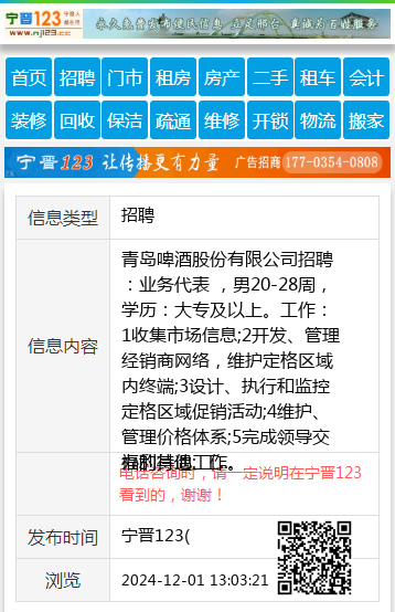 青岛啤酒股份有限公司招聘:业务代表 ,男20-28周,学历:大专及以上。工作:1收集市场信息;2开发、管理经销商网络,维护定格区域内终端;3设计、执行和监控定格区域促销活动;4维护、管理价格体系;5完成领导交办的其他工作。