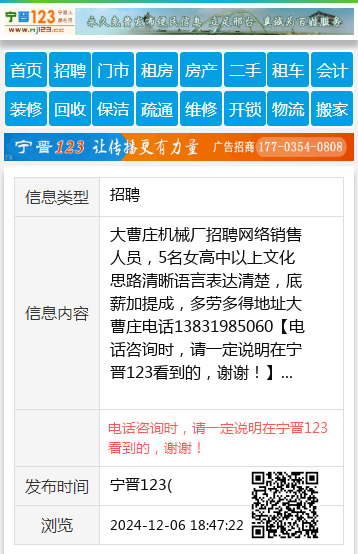大曹庄机械厂招聘网络销售人员,5名女高中以上文化思路清晰语言表达清楚,底薪加提成,多劳多得地址大曹庄电话13831985060 【电话咨询时,请一定说明在宁晋123看到的,谢谢!】 |