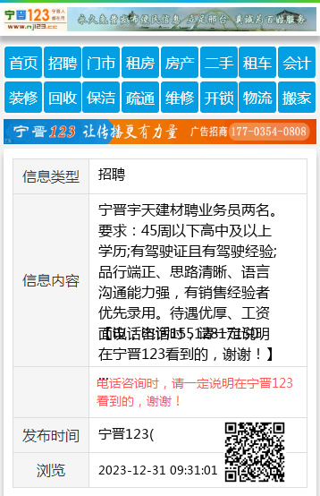 宁晋宇天建材聘业务员两名。要求:45周以下高中及以上学历;有驾驶证且有驾驶经验;品行端正、思路清晰、语言沟通能力强,有销售经验者优先录用。待遇优厚、工资面议;电话15512817150