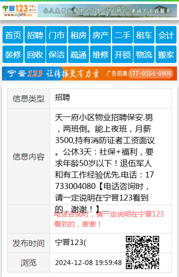 天一府小区物业招聘保安.男,两班倒。能上夜班,月薪3500,持有消防证者工资面议。公休3天:社保+福利,要求年龄50岁以下!退伍军人和有工作经验优先.电话:17733004080 【电话咨询时,请一定说明在宁晋123看到的,谢谢!】 |