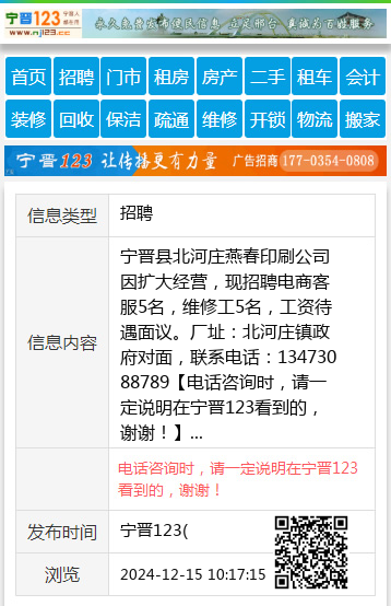 宁晋县北河庄燕春印刷公司因扩大经营,现招聘电商客服5名,维修工5名,工资待遇面议。厂址:北河庄镇政府对面,联系电话:13473088789 【电话咨询时,请一定说明在宁晋123看到的,谢谢!】 |