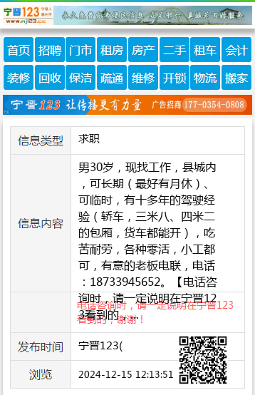 男30岁,现找工作,县城内,可长期(最好有月休)、可临时,有十多年的驾驶经验(轿车,三米八、四米二的包厢,货车都能开),吃苦耐劳,各种零活,小工都可,有意的老板电联,电话:18733945652。 【电话咨询时,请一定说明在宁晋123看到的,谢谢!】 |