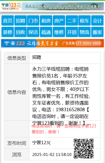永力三羊线缆招聘:电缆销售报价员1名,年龄35岁左右,有电缆销售报价工作的优先,男女不限;40岁以下男性库管一名,有工作经验、叉车证者优先,薪资待遇面议,电话:19831652808 【电话咨询时,请一定说明在宁晋123看到的,谢谢!】 |