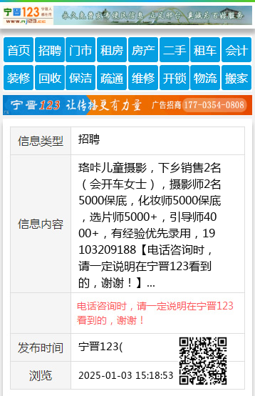 珞咔儿童摄影,下乡销售2名(会开车女士),摄影师2名5000保底,化妆师5000保底,选片师5000+,引导师4000+,有经验优先录用,19103209188 【电话咨询时,请一定说明在宁晋123看到的,谢谢!】 |