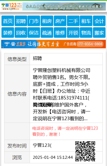 宁晋隆创塑料机械有限公司 聘外贸销售1名。男女不限。底薪+提成,工作时间:9小时【白班】办公地址:中近村联系电话:18531974111(微信同号)