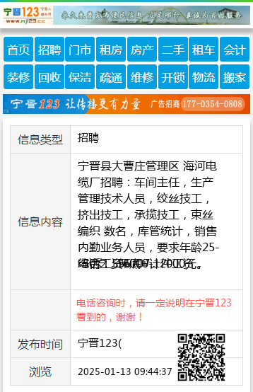 宁晋县大曹庄管理区 海河电缆厂招聘:车间主任,生产管理技术人员,绞丝技工, 挤出技工,承揽技工,束丝 编织 数名,库管统计,销售内勤业务人员,要求年龄25--50岁,保底+计件工资,