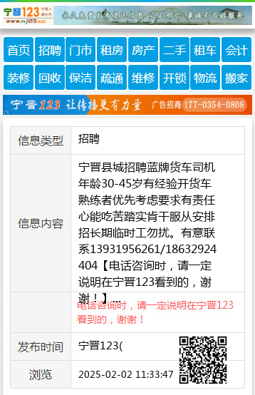 宁晋县城招聘蓝牌货车司机年龄30-45岁有经验开货车熟练者优先考虑要求有责任心能吃苦踏实肯干服从安排招长期临时工勿扰。有意联系13931956261/18632924404 【电话咨询时,请一定说明在宁晋123看到的,谢谢!】 |