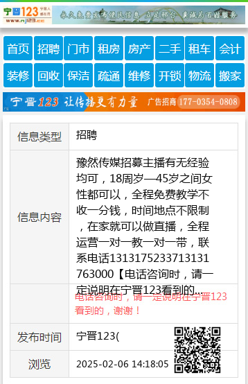 豫然传媒招募主播有无经验均可,18周岁—45岁之间女性都可以,全程免费教学不收一分钱,时间地点不限制,在家就可以做直播,全程运营一对一教一对一带,联系电话1313175233713131763000 【电话咨询时,请一定说明在宁晋123看到的,谢谢!】 |