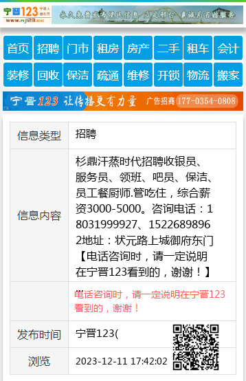 杉鼎汗蒸时代招聘收银员、服务员、领班、吧员、保洁、员工餐厨师.管吃住,综合薪资3000-5000。咨询电话:18031999927、15226898962地址:状元路上城御府东门 【电话咨询时,请一定说明在宁晋123看到的,谢谢!】 |
