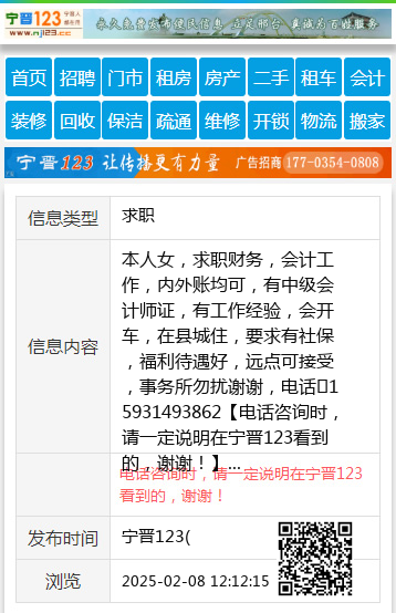 本人女,求职财务,会计工作,内外账均可,有中级会计师证,有工作经验,会开车,在县城住,要求有社保,福利待遇好,远点可接受,事务所勿扰谢谢,电话15931493862 【电话咨询时,请一定说明在宁晋123看到的,谢谢!】 |
