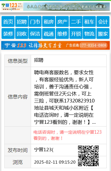 聘电商客服数名,要求女性,有客服经验优先,新人可培训,善于沟通责任心强,需倒班管住2天公休,可上三险,可联系17320823910地址县城天和城小区附近 【电话咨询时,请一定说明在宁晋123看到的,谢谢!】 |