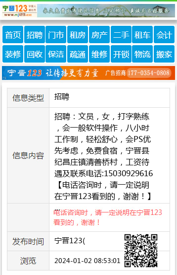 招聘:文员,女,打字熟练,会一般软件操作,八小时工作制,轻松舒心,会PS优先考虑,免费食宿,宁晋县纪昌庄镇清善桥村,工资待遇及联系电话:15030929616 【电话咨询时,请一定说明在宁晋123看到的,谢谢!】 |