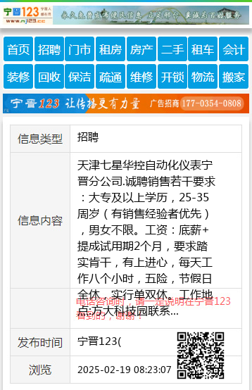 天津七星华控自动化仪表宁晋分公司.诚聘销售若干要求:大专及以上学历,25-35周岁(有销售经验者优先),男女不限。工资:底薪+提成试用期2个月,要求踏实肯干,有上进心,每天工作八个小时,五险,节假日全休,实行单双休。工作地点:方大科技园联系电话:13752055332刘经理.17867425860罗经理, 【电话咨询时,请一定说明在宁晋123看到的,谢谢!】 |