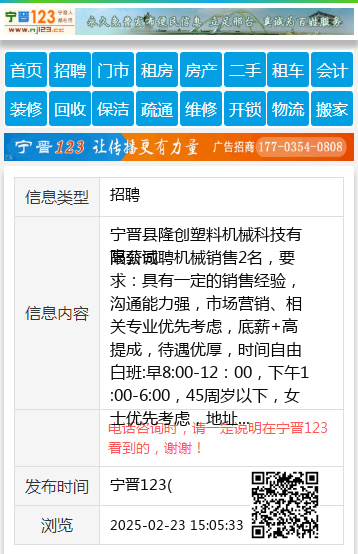 高薪诚聘机械销售2名,要求:具有一定的销售经验,沟通能力强,市场营销、相关专业优先考虑,底薪+高提成,待遇优厚,时间自由白班:早8:00-12:00,下午1:00-6:00,45周岁以下,女士优先考虑,地址:宁晋县城西。想挣钱就来找我,欢迎您加入我们的团队,联系电话:15383096707/15130903022 【电话咨询时,请一定说明在宁晋123看到的,谢谢!】 |