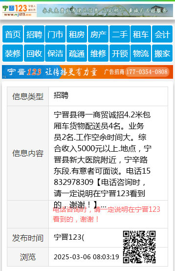 宁晋县得一商贸诚招4.2米包厢车货物配送员4名。业务员2名.工作空余时间大。综合收入5000元以上.地点,宁晋县新大医院附近,宁辛路东段.有意者可面谈。电话15832978309 【电话咨询时,请一定说明在宁晋123看到的,谢谢!】 |