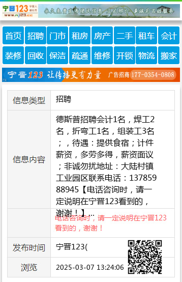 德斯普招聘会计1名,焊工2名,折弯工1名,组装工3名;,待遇:提供食宿;计件薪资,多劳多得,薪资面议;非诚勿扰地址:大陆村镇工业园区联系电话:13785988945 【电话咨询时,请一定说明在宁晋123看到的,谢谢!】 |
