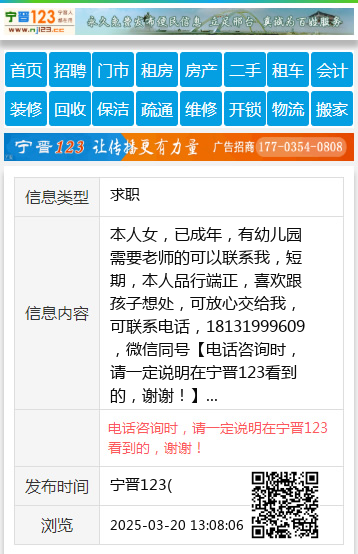 本人女,已成年,有幼儿园需要老师的可以联系我,短期,本人品行端正,喜欢跟孩子想处,可放心交给我,可联系电话,18131999609,微信同号 【电话咨询时,请一定说明在宁晋123看到的,谢谢!】 |