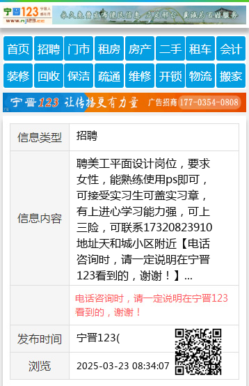 聘美工平面设计岗位,要求女性,能熟练使用ps即可,可接受实习生可盖实习章,有上进心学习能力强,可上三险,可联系17320823910地址天和城小区附近 【电话咨询时,请一定说明在宁晋123看到的,谢谢!】 |