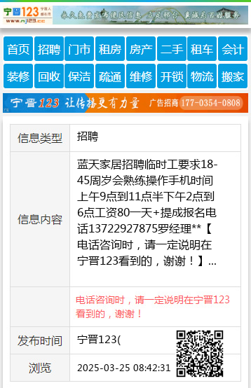 蓝天家居招聘临时工要求18-45周岁会熟练操作手机时间上午9点到11点半下午2点到6点工资80一天+提成报名电话13722927875罗经理** 【电话咨询时,请一定说明在宁晋123看到的,谢谢!】 |