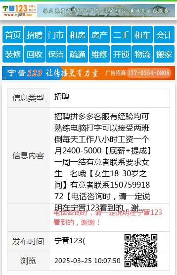 | 防骗提醒: | 宁晋123(www.nj123.cc)提醒您:手工活、网络兼职、刷单,都是骗子!凡以各种名义收取费用的都是骗子!找工作是往兜里挣钱,让你往外掏钱的都是骗子!异地招聘请提高警惕,谨防诈骗! |