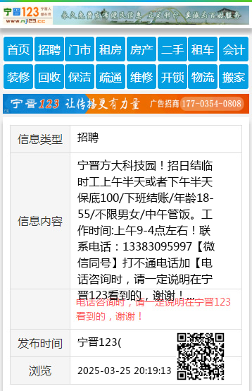 宁晋方大科技园!招日结临时工上午半天或者下午半天保底100/下班结账/年龄18-55/不限男女/中午管饭。工作时间:上午9-4点左右!联系电话:13383095997【微信同号】打不通电话加 【电话咨询时,请一定说明在宁晋123看到的,谢谢!】 |