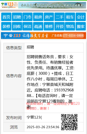 招聘销售话务员,要求:女性、负责任、有销售经验者优先录用。待遇优厚。工资:底薪(3000)+提成,日工作八小时,每周日单休。工作地点:宁晋县城天和城附近。应聘电话:19339296888... 【电话咨询时,请一定说明在宁晋123看到的,谢谢!】 |