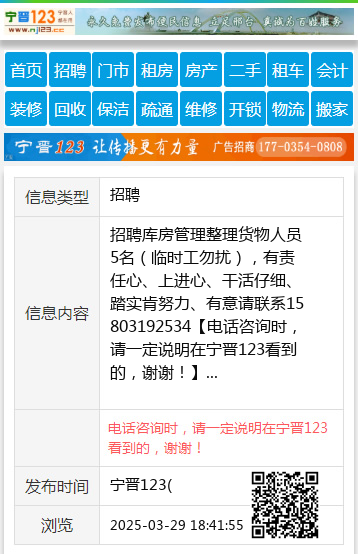 招聘库房管理整理货物人员5名(临时工勿扰),有责任心、上进心、干活仔细、踏实肯努力、有意请联系15803192534 【电话咨询时,请一定说明在宁晋123看到的,谢谢!】 |