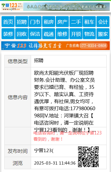 欧尚太阳能光伏板厂现招聘财务.会计助理、办公室文员要求已婚已育、有经验,35岁以下、踏实认真、工资待遇优厚,有社保,男女均可,有意可拨打电话:17798006098同V.地址:河渠镇大召 【电话咨询时,请一定说明在宁晋123看到的,谢谢!】 |