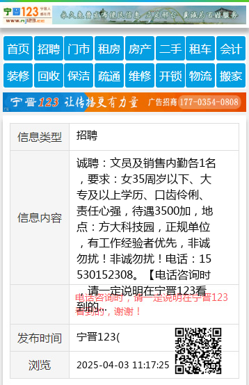 诚聘:文员及销售内勤各1名,要求:女35周岁以下、大专及以上学历、口齿伶俐、责任心强,待遇3500加,地点:方大科技园,正规单位,有工作经验者优先,非诚勿扰!非诚勿扰!电话:15530152308。 【电话咨询时,请一定说明在宁晋123看到的,谢谢!】 |