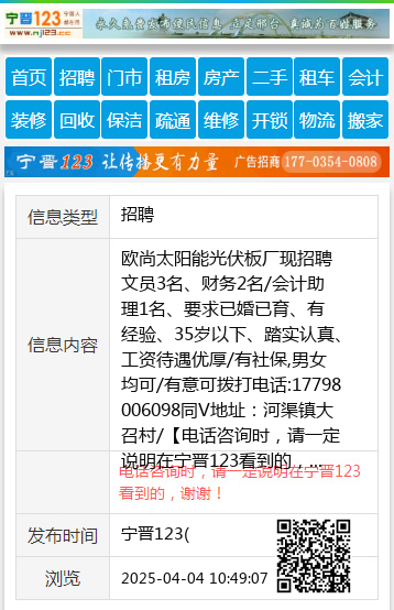 欧尚太阳能光伏板厂现招聘文员3名、财务2名/会计助理1名、要求已婚已育、有经验、35岁以下、踏实认真、工资待遇优厚/有社保,男女均可/有意可拨打电话:17798006098同V地址:河渠镇大召村/ 【电话咨询时,请一定说明在宁晋123看到的,谢谢!】 |