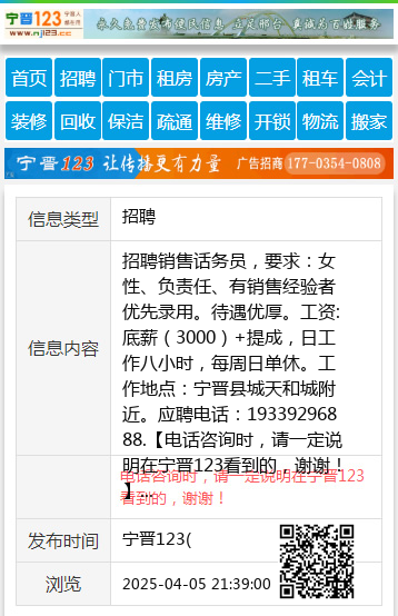 招聘销售话务员,要求:女性、负责任、有销售经验者优先录用。待遇优厚。工资:底薪(3000)+提成,日工作八小时,每周日单休。工作地点:宁晋县城天和城附近。应聘电话:19339296888. 【电话咨询时,请一定说明在宁晋123看到的,谢谢!】 |