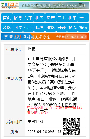 正工电缆有限公司招聘:开票文员1名(最好在会计事务所干活),诚聘标书专员1名,电缆销售内勤3名,外勤3名人员(高中及以上学历)、国网运作经理,要求有工作经验男女不限、工作地点:洨口工业区,联系电话:18631990890 【电话咨询时,请一定说明在宁晋123看到的,谢谢!】 |