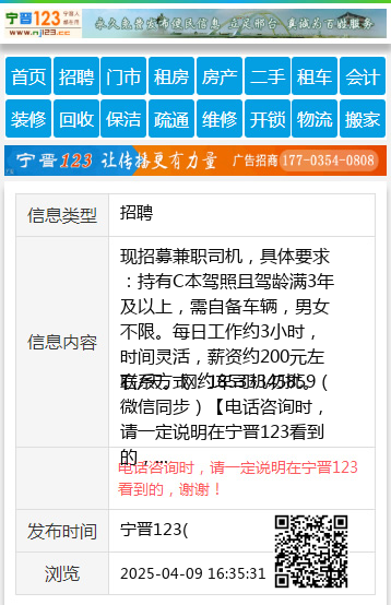 现招募兼职司机,具体要求:持有C本驾照且驾龄满3年及以上,需自备车辆,男女不限。每日工作约3小时,时间灵活,薪资约200元左右/天。网约车司机勿扰。