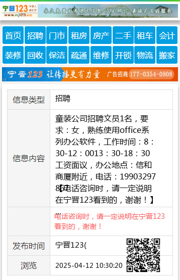 童装公司招聘文员1名,要求:女,熟练使用office系列办公软件,工作时间:8:30-12:0013:30-18:30工资面议,办公地点:信和商厦附近,电话:19903297867