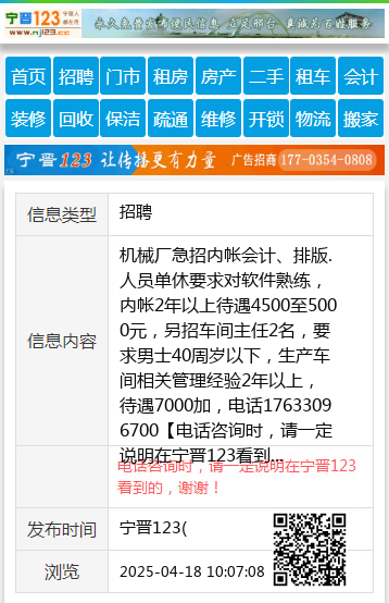 机械厂急招内帐会计、排版.人员单休要求对软件熟练,内帐2年以上待遇4500至5000元,另招车间主任2名,要求男士40周岁以下,生产车间相关管理经验2年以上,待遇7000加,电话17633096700 【电话咨询时,请一定说明在宁晋123看到的,谢谢!】 |