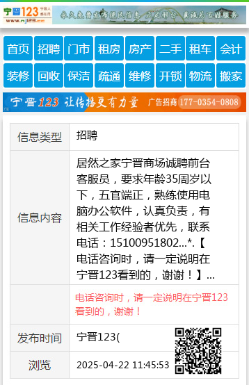 居然之家宁晋商场诚聘前台客服员,要求年龄35周岁以下,五官端正,熟练使用电脑办公软件,认真负责,有相关工作经验者优先,联系电话:15100951802...*. 【电话咨询时,请一定说明在宁晋123看到的,谢谢!】 |