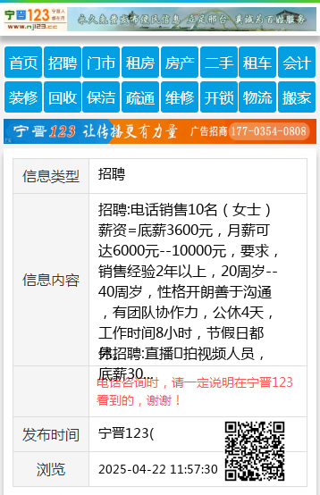 招聘:电话销售10名(女士)薪资=底薪3600元,月薪可达6000元--10000元,要求,销售经验2年以上,20周岁--40周岁,性格开朗善于沟通,有团队协作力,公休4天,工作时间8小时,节假日都休。