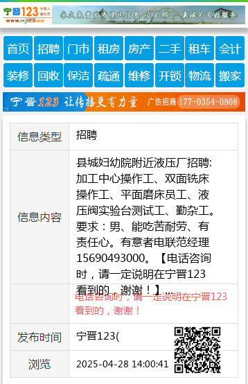 县城妇幼院附近液压厂招聘:加工中心操作工、双面铣床操作工、平面磨床员工、液压阀实验台测试工、勤杂工。要求:男、能吃苦耐劳、有责任心。有意者电联范经理15690493000。 【电话咨询时,请一定说明在宁晋123看到的,谢谢!】 |