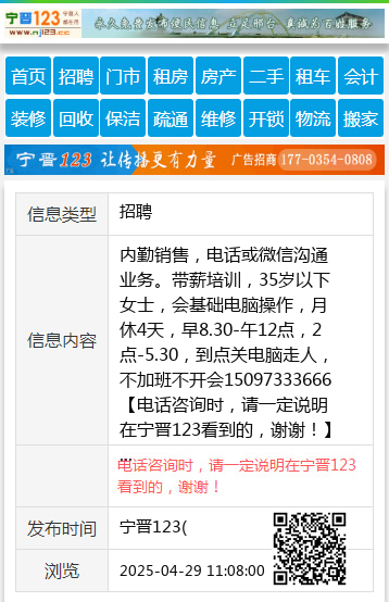 内勤销售,电话或微信沟通业务。带薪培训,35岁以下女士,会基础电脑操作,月休4天,早8.30-午12点,2点-5.30,到点关电脑走人,不加班不开会15097333666 【电话咨询时,请一定说明在宁晋123看到的,谢谢!】 |