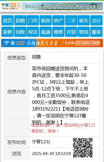 菜市场招聘送货男司机,本县内送货,要求年龄30-50岁C证,3年以上驾龄,早上5点-12点下班,下午不上班,首月工资3500元.熟悉后4000元+全勤饭补,联系电话18931922211 【电话咨询时,请一定说明在宁晋123看到的,谢谢!】 |