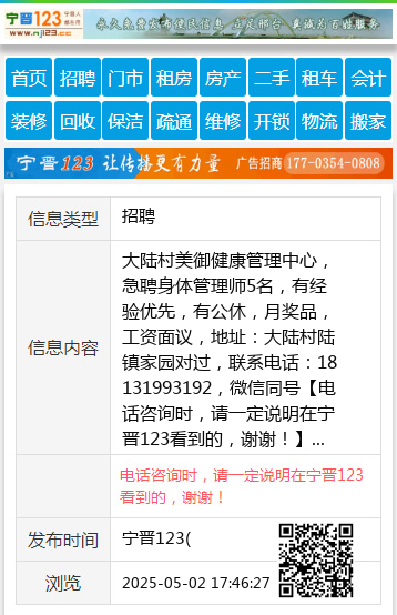 大陆村美御健康管理中心,急聘身体管理师5名,有经验优先,有公休,月奖品,工资面议,地址:大陆村陆镇家园对过,联系电话:18131993192,微信同号 【电话咨询时,请一定说明在宁晋123看到的,谢谢!】 |